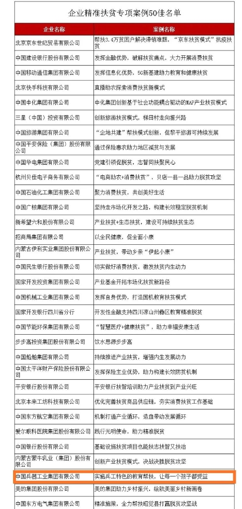 近日,國務院扶貧辦發布2020年企業精準扶貧案例獲獎名單,中國兵器工業集團有限公司《實施兵工特色的教育幫扶,讓每一個孩子都受益》案例入選2020年企業精準扶貧專項案例“50佳”。