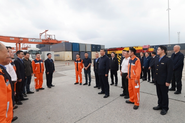 隨后,習近平來到重慶鐵路集裝箱中心站,聽取貨物集散、運輸路徑、運營成本和效益等介紹,同貨車司機、列車司機、裝卸工人、場站管理人員等親切交流,詢問他們的工作強度、勞動保護、節假日休息和收入情況。習近平說,大家在物流一線,也是在對外開放一線,通過你們的辛勤勞動,很多商品跨越山海、走向世界,你們的工作很有意義。推動西部大開放、促進西部大開發,物流很重要,大家要繼續努力,不斷創造新的業績,作出新的貢獻。