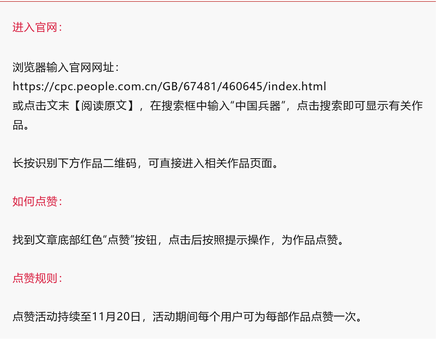 為持續提升中央企業整體形象,凝聚干事創業精神動力,助力“十四五”圓滿收官,推動“十五五”順利開局,今年6月,第八屆中央企業優秀故事暨2025AIGC創意傳播作品征集展示活動正式啟動。本次活動以“決戰收官‘十四五’ 啟航奮進開新篇”為主題,圍繞“五年成就”“時代擔當”兩個維度進行征集。鼓勵廣大中央企業以“輕量化、強互動”創新表達形式,增強吸引力感染力,充分展現中央企業精神面貌。參選作品擇優在活動官網進行集中展示,并將適時舉辦第八屆中央企業優秀故事暨2025AIGC創意傳播作品發布活動,開展優秀故事成果展、AIGC創意傳播成果專題展覽。 兵器工業集團共有45部作品入選,歡迎大家一起來為“兵器好故事”點贊! 點贊方法 |